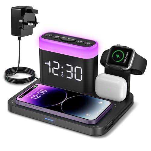 【𝟓 𝐢𝐧 𝟏 𝐌𝐚𝐠𝐧𝐞𝐭𝐢𝐜 𝐖𝐢𝐫𝐞𝐥𝐞𝐬𝐬 𝐂𝐡𝐚𝐫𝐠𝐢𝐧𝐠 𝐒𝐭𝐚𝐭𝐢𝐨𝐧】Multifunctional magnetic wireless charging station,you can have the benefits of a large digital alarm clock + 7 colors night light + iPhone charger + apple watch and airpods charger.Free yourself from charging cables,save space and organize your desk, bedroom and nightstand,it is both useful and good looking.