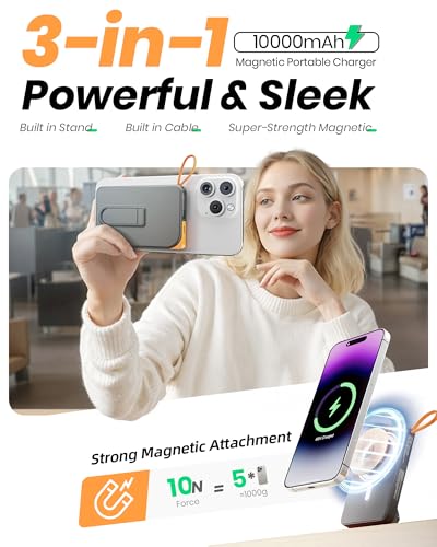 for Magsafe Power Bank iPhone, 10000mAh Foldable Stand Magnetic Portable Charger with 22.5W USB-C Cable, Wireless Powerbank Fast Charging, Battery Pack for iPhone 17 16 15 14 13 12 Series