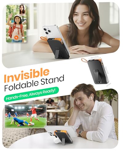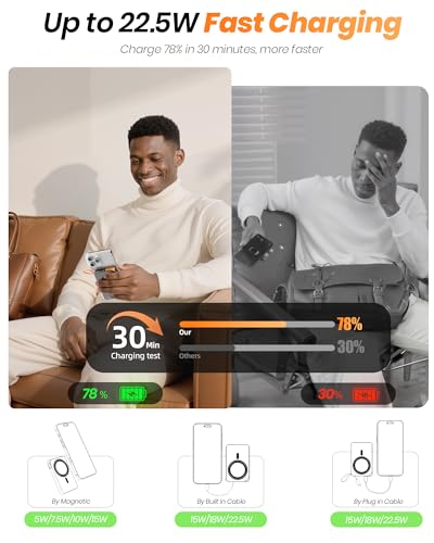 【Built-in 22.5W USB C Cable Fast Charging & 60° Foldable Stand】Beyond 15W max wireless charging, this magnetic power bank iphone comes with a built-in 22.5W USB-C cable—no extra cords needed. Charge a new iPhone from 0% to 78% in just 30 minutes—twice as fast as most portable chargers. The integrated adjustable stand offers hands-free viewing at multiple angles perfect for videos and calls.