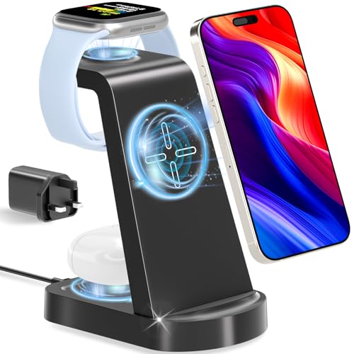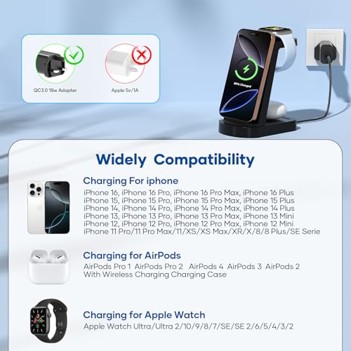 Wireless Charger 3 in 1, bakibo Wireless Charging Station Dock Stand for i Phone 16/15/14/13/12/11 Watch 10/9/8/7/6 Pro Max Plus, Air-Pods 3/2/1/pro (with Adapter), Black