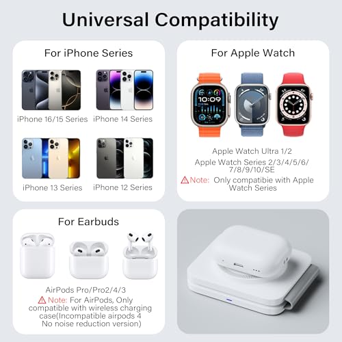 Apple Wireless Charging Station: Charge your iPhone, Apple Watch, and AirPods simultaneously with this powerful wireless apple charger 3 in 1. Designed for full compatibility with iPhone 16/15/14/13/12 (Pro/Max/Plus), Apple Watch Ultra 2/Ultra/10/9/8/7/6/5/4/3/SE, and AirPods Pro/4/3/2/1. (Note: AirPods 4 not compatible with non-ANC version)
