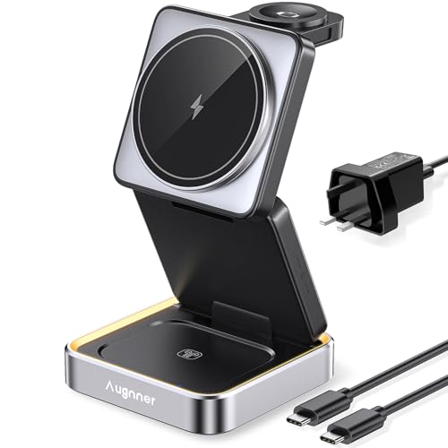 Why Choose Us–New Upgraded:Augnner 3-in-1 Magnetic wireless charger has greatly improved its appearance, charging speed(15W Max) and safety. Exquisite aluminum alloy base design to enhance the texture, stability and heat radiation . And has an independent control night light, accompanying you to sleep. A stable structure can withstand tens of thousands of repeated folding. Net weight is 9.17 ounces; Material: Aluminum alloy + ABS