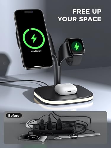 【3-in-1 Charging Station for Apple Devices】This fast 3 in 1 magnetic wireless charger can power your iPhone,Apple watch and AirPods simultaneously. It’ll fully charge iPhone 17 and Apple Watch S11 in just about 1.5-2.0 hours(other non-applle brand need 3.5 hours).The mag-safe charger stand only suitable for iPhone 17/16/15/14/13/12 series,for Apple watch S11/10/9/8/7/6/5/4/3/2/SE 3/SE 2/SE/Ultra 3/Ultra 2/Ultra, AirPods Pro/Pro 2, Airpods 2/3/4(with wireless charging case).