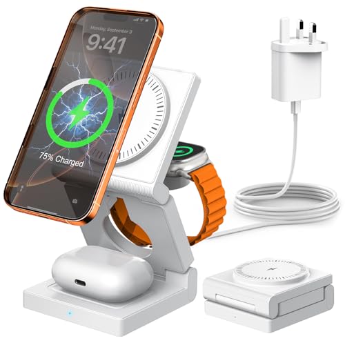 【Upgrade 3 in 1 Wireless Charging Station】The magnetic wireless charger is compatible with iPhone 17/17 Pro/17 Plus/17 Pro Max/16/15/14/13/12 series, the watch area is only for iWatch 3/4/5/6/SE/7/8/9/Ultra 1/Ultra 2, and earphone area is only suitable for AirPods 2/3/Pro 1/Pro 2. Our 3 in 1 Wireless Charging Stand provides 15W fast charging with secure magnetic alignment. Note: Please use a Mag-Safe case for stronger magnetization, ordinary cases will weaken the magnetic adsorption.