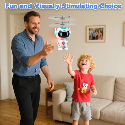 【Quiet Indoor Use & Safe Durable Build】Helicopter toy features low noise propeller tech for quiet operation, letting kids play indoors without disturbing family, neighbors or pets enjoy peaceful at home play as the robot flies smoothly. Equipped with soft protective propeller guards to prevent injuries, plus a high quality impact resistant body that withstands falls and bumps. Drone toys designed with child safety in mind, keeping parents at ease during kids flying fun.