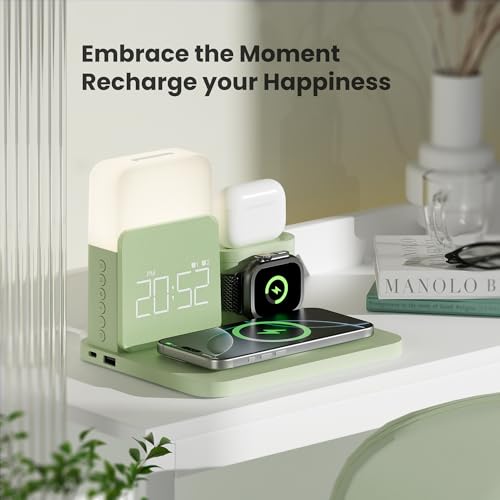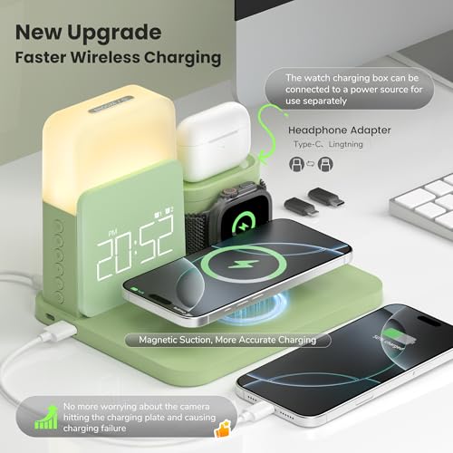 COLSUR 6 in 1 Wireless Charging Station, Magnetic 18W Wireless Charger with Alarm Clock, Night Light, Wireless Charger Stand for iPhone 16 15 14 13 12 11 X Pro Max, Apple Watch, AirPods