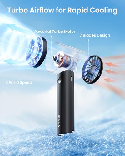 Strong Wind Turbo hand Fan: Updated handheld fan with powerful airflow. This pocket fan features a high‑performance turbo motor and 7 wedge-shaped blades that draw in air efficiently. The airflow is accelerated and compressed through a ducted turbine, then pushed out with force through the air ducts — delivering a stronger, faster cooling breeze — Great for hot summer days