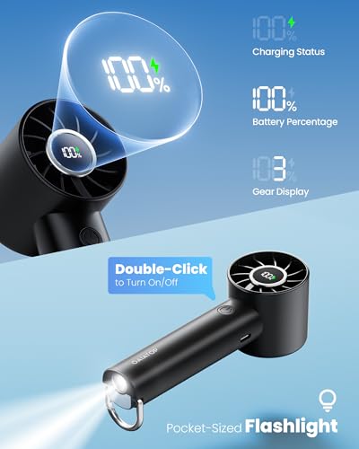 Fast Charging & Easy Operation: This USB rechargeable fan supports fast charging, can be fully charged in 2.5 hours and provides up to 6.5 hours of cooling time when fully charged. Press once for using fan; twice for using torch. The screen shows current speed, battery status, and a flashing green light when charging