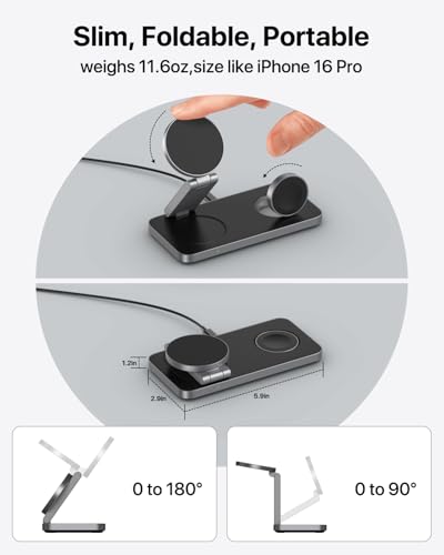 [Ultra-Compact Foldable Design]- With 2.9 In*5.9 In*1.2 In ultra-compact size, at only 11.6 oz, this 3 in 1 wireless charging station boasts a size smaller than 16 pro when folded, it’s perfect for travel, office, and home, or any other occasions