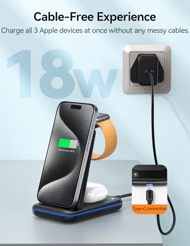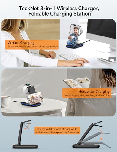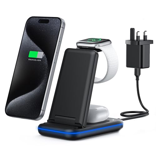 TECKNET 3 in 1 Wireless Charging Station,Fast Wireless Charger Stand for iPhone 17/16/15/14/13/12 or Samsung, Apple Watch & AirPods with 18W UK Adapter-Black