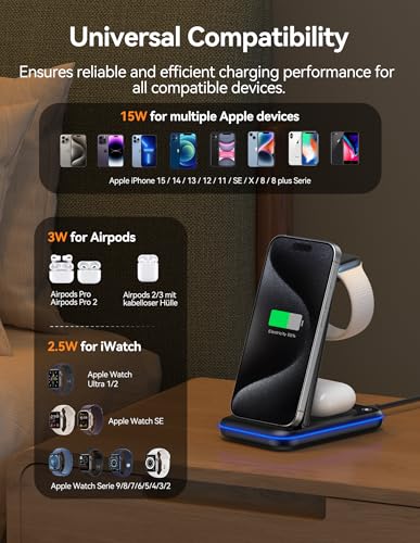 【Universal Compatibility】 This wireless charger compatible with iPhone 17/16/15/14/13/12 series and Samsung series,iWatch Ultra/10/9/8/7/6/5/4/3/2/SE,AirPods Pro/4/3/2.(Notice:Not suitable for Samsung Watch and other watches. Please remove the silicone protective cover of Apple Watch or AirPods before charging).